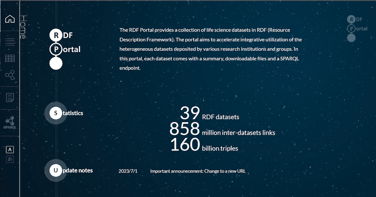 RDFポータル (旧:NBDC RDFポータル) は、RDF形式の生命科学データベースを集積したポータルサイトです。